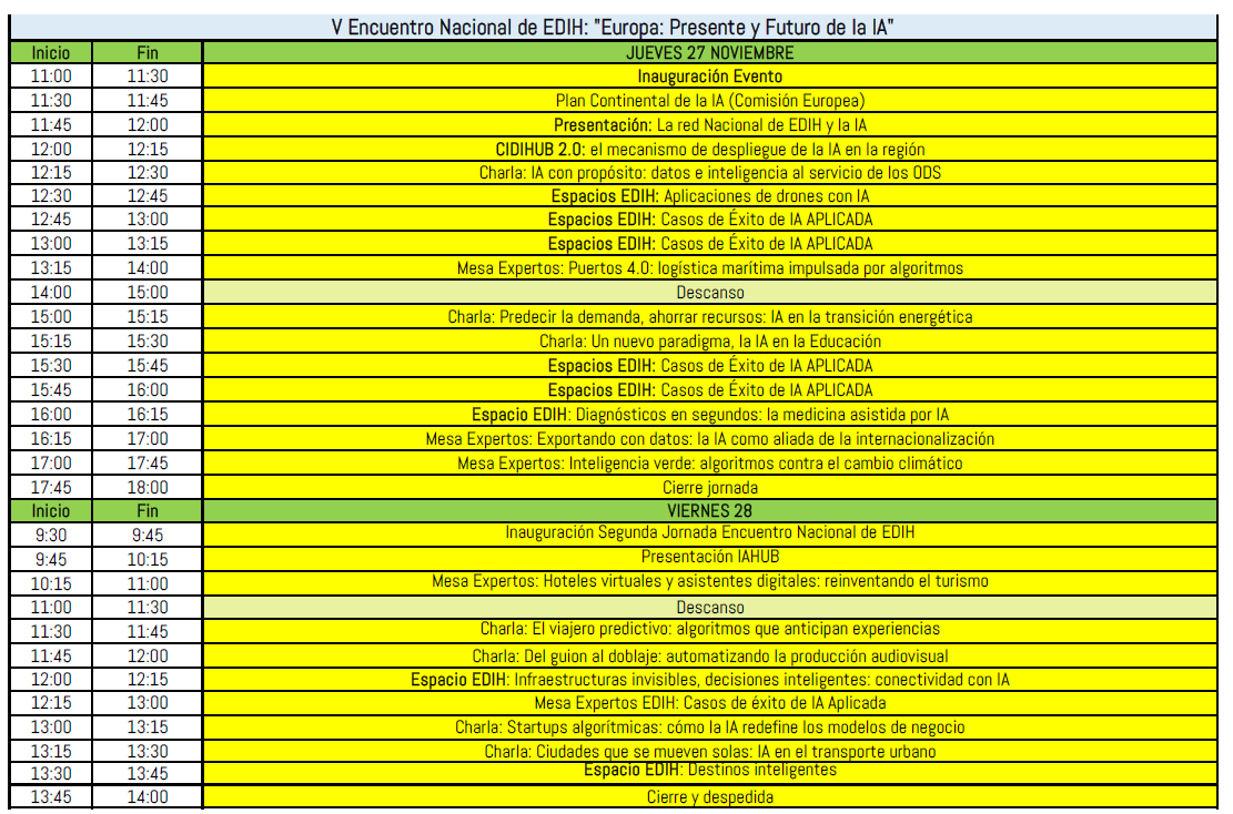 Desde CIDIHUB, en colaboración con Digital Impulse Hub, la Universidad Fernando Pessoa Canarias y nuestros socios regionales, tenemos el placer de invitarles formalmente a participar en el V Encuentro Nacional de EDIH: “Europa: Presente y Futuro de la IA”, que se celebrará los días 27 y 28 de noviembre de 2025 en Gran Canaria.